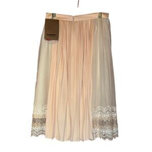 Description: Meet the skirt your spring wardrobe deserves. This Burberry midi skirt in peachy-pink pairs romantic lace with pleated panels for a fluid, feminine look. Features: - Romantic lace overlay & pleated chiffon panels - Back zip closure for a clean silhouette - Premium polyester shell & silk lining - Condition: New with tags (NWT) - Size: Medium (US 8)