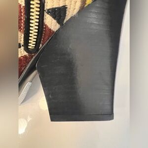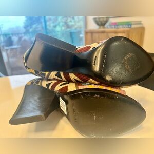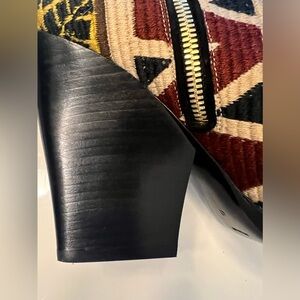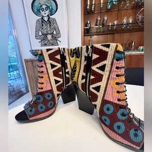 Elevate your shoe game with these stunning Burberry Prorsum Virginia booties. The ankle-high, peep-toe boots feature a beautiful tapestry upper material in multicoloured Aztec and Bohemian style. They're lace-up with a side zipper for easy use, stacked split-wedge heel, golden logo plate at the back, and leather lining. Made in Italy.