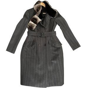Burberry Prorsum Gray Wool Herringbone Double Breasted Mink Collar Peacoat