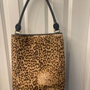 This shoulder bag features a striking leopard print design in brown and black, making it a standout accessory. Crafted with a textured material, it offers a luxurious feel and a spacious interior for all your essentials. The sturdy black leather handles ensure comfortable carrying, making it both stylish and practical. Comes with wristlet/pouch. Slight rub spots on back of bag. Unseen see when carrying