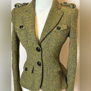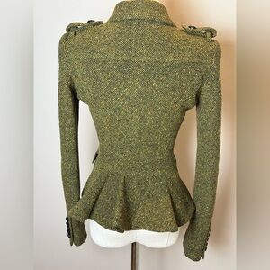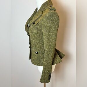 Burberry Prorsum, green tweed jacket, peplum blazer, tailored wool jacket, designer resale, XS Burberry jacket, classic British style, Poshmark Burberry, Depop Prorsum, eBay luxury outerwear, Donegal tweed blazer, high fashion resale, fall fashion, structured wool coat, Burberry peplum