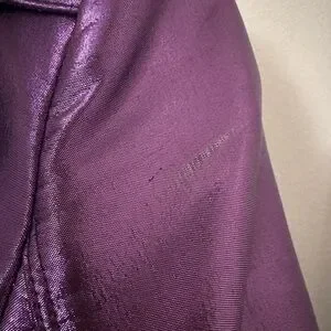 Pre-owned. There are some visible surface marks and light scuffs on the metallic satin due to the reflective fabric (shown in photos). The coat remains structurally excellent and still presents beautifully when worn.