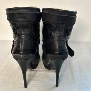 The Burberry Prorsum Runway Aviator Ankle Boots are a high-end fashion item for women. Made in Italy, these boots feature a black leather upper, fur lining, and stiletto heel measuring over 4 inches. The boots are secured with buckle closures and have a unique aviator style. The model is Burberry Prorsum Aviator and the boots are lined for added comfort.