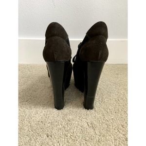 Gorgeous, edgy, sky-high platform wedges. These are a work of art and not for the timid. The heel is approximately 6 inches, with a 2 inch platform but surprisingly comfortable!