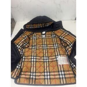 This stylish Burberry quilted jacket for kids features the iconic Burberry check lining and a cozy hood. Despite minor wear, it remains in excellent condition, offering both warmth and elegance.