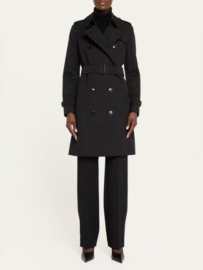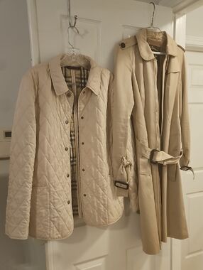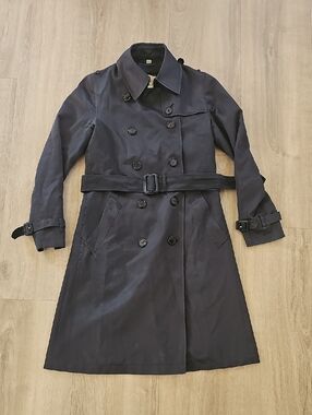 Classic Burberry quilted trench in deep navy. Diamond-quilted exterior with a belted waist. Button and zip front closure. Fold-over collar and storm flap details. Signature checked lining at the interior.