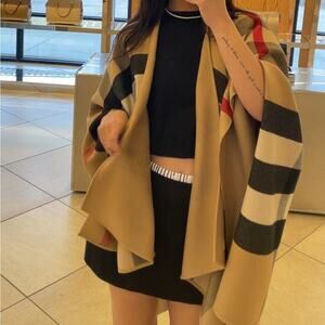 Elegant Burberry cape in camel with black check pattern. Ideal for chic layering.