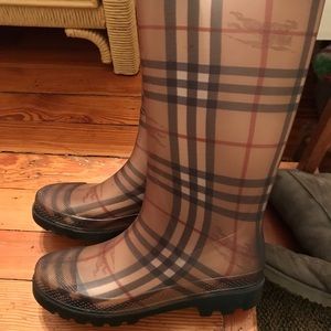 Knee high gently used authentic Burberry rain boots! Great to spice up an outfit on a rainy day, or even to wear while cleaning the snow!