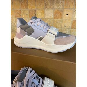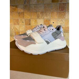 Discover the perfect blend of luxury and comfort with the Burberry Ramsey Vintage Sneakers. Designed for unisex adults, these pale grey sneakers feature a distinctive check fabric that effortlessly elevates your casual wardrobe. The lace-up closure ensures a secure fit, while the round toe shape offers all-day comfort. Ideal for any season, these sneakers are a must-have for fashion-forward individuals who appreciate timeless style. New in box, though the box may show some wear, these sneakers are ready to step into your collection.