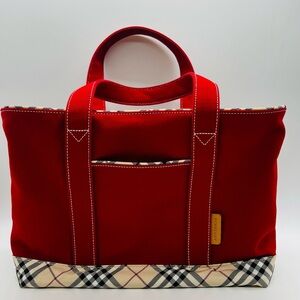 Burberry Red Canvas Tote with Plaid Accents and Top Zipper