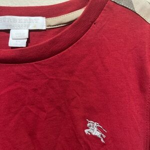 This Burberry long sleeve tee in a vibrant red hue features a classic crewneck style and a subtle embroidered logo on the chest. Crafted from a soft cotton blend, it offers comfort and style for everyday wear.New just little hold on top other than that New boy or girl