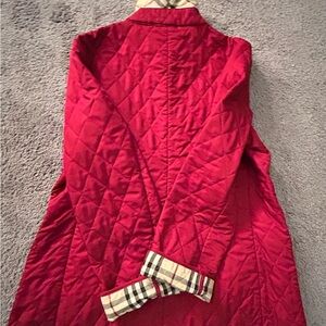 Authentic Burberry London Quilted Jacket. Jacket is a deep deep red/burgundy color. Jacket is button down with with 4 snap buttons. One button has some slight tarnishing which can been seen in the pic. Comes from a pet and some free home. Shows mild signs of wear.