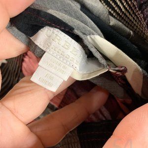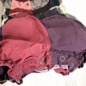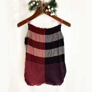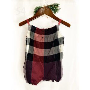 This red Burberry romper will keep your child fashionable but comfortable. The red, purple, and black Burberry plaid give it a different look that sets it apart from the rest. Spaghetti shoulders straps, elastic leg holes with snaps, and elastic chest round out the features that make this a special piece of clothing. Made in Thailand. Size 6 months.
