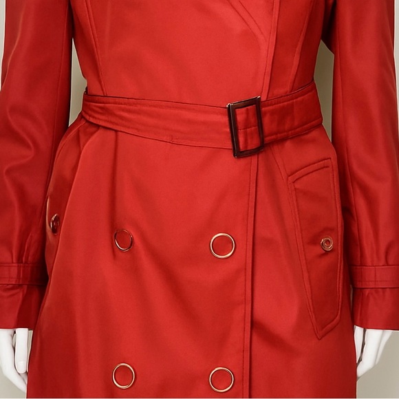 Authentic Burberry women’s long double-breasted trench coat in a stunning red colorway. This is a brand new, never worn piece with original tags attached.