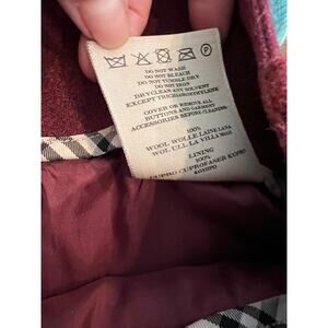 Authentic Burberry Red Wool Button Front Military Style Pencil Skirt 4. Good preowned condition with Logo Buttons, flap pockets and belt loops. Fully lined with Nova Check accent piping, functional pockets. 100% wool with pleated back