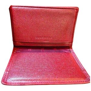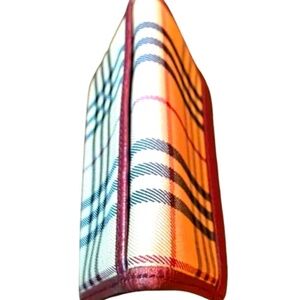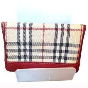 Stylish Burberry wallet. Features classic plaid design. Red leather trim. Perfect for everyday use.