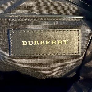 This chic backpack is crafted of nylon canvas in black with tan calfskin trims. The bag features adjustable shoulder straps, a front pocket, two side pockets, and polished gold hardware. The top opens to a black Burberry fabric interior with a zipper and patch pocket.
