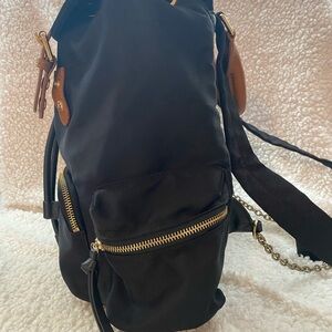 This sleek black backpack features elegant brown accents, perfect for any occasion. Its versatile design makes it ideal for both casual and professional settings. There’s turnishing in the chain of the backpack and a small indent in the top handle shown in the pictures other than that the bag is clean and in good condition.