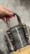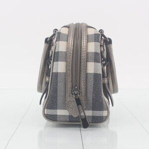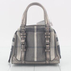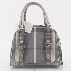 Silver-tone and multicolor Shimmer check woven Burberry Shimmer Check Sophie Bowler Bag with gunmetal hardware, dual rolled top handles, black woven lining and zip closure at top.