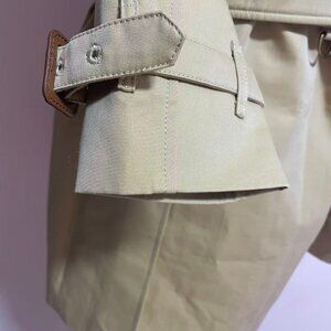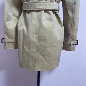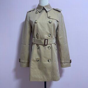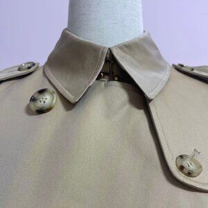 This Burberry trench coat features a classic notched lapel design with a double-breasted button closure, complete with button detailing and a belt. This is a trench coat style.
