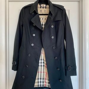 Burberry short trench coat in black in size 6. Includes original dust cover. Purchased at the Burberry Store. Great condition.