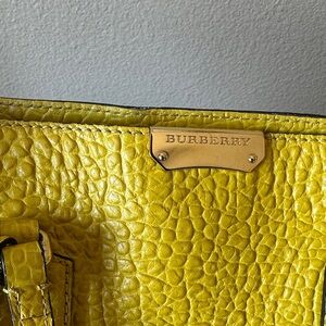 Brighten your style with this vibrant yellow textured leather tote bag in Burberry’s signature grained leather. Two interior pockets and one interior large zip pocket. Plenty of space for an iPad, Laptop. I have a massive 15” laptop inside it for scale (see pics). Gold hardware with minor wear. No Feet on the bottom. Includes dust bag. One owner.