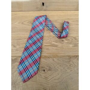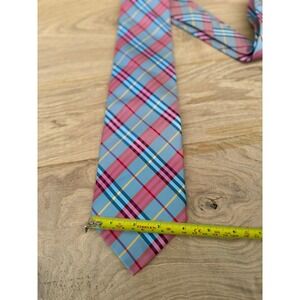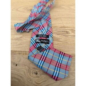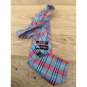 A sophisticated Burberry necktie featuring a classic plaid pattern. This tie showcases a blend of light blue, pink, red, and yellow hues, creating a visually appealing and versatile accessory. The design is meticulously crafted, offering a refined touch to any formal or business ensemble. Its construction ensures a comfortable fit and a polished appearance, making it a staple in any discerning gentleman's wardrobe.