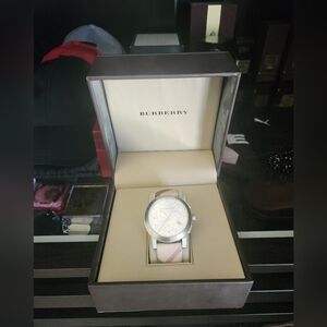 Stylish Burberry watch with a silver case. Cream strap with subtle pattern. Timeless elegance.