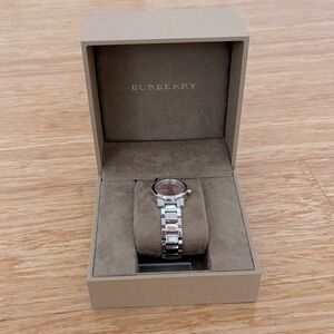 Sophisticated Burberry watch with a silver band and pink face. Ideal for any occasion. comes with the box as well