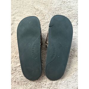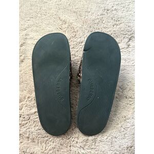 Condition: In fair, pre-owned condition. The upper suede Burberry Logo on each shoe is pealing in certain locations. On the left shoe it's mostly located on the outter left portion. On the right shoe, it's mostly concentrated on the outer rim of the slides. I have uploaded detailed photos of the slides so you can see where the flaws are located on the upper leather suede portion. The bottom of the left sole of the shoe has indentations. Both bottom soles show major signs of use and only about 65% of the tread remains. Shoes do not come with original tags or box.