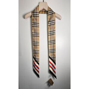 This exquisite Burberry silk ribbon scarf blends classic British heritage with modern flair. Designed in the coveted Kensington Posy TB Monogram print, it features a sophisticated mix of the iconic Burberry check with bold candy-striped color blocking in red, pale blue, ivory, and gold. Crafted in Italy from 100% pure silk, this piece offers endless styling options—wear it as a neck scarf, hair tie, handbag accent, or chic wrist wrap.
