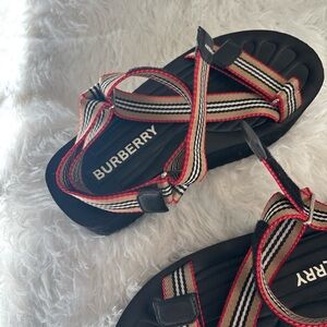 Stylish Burberry sandals with striped design. Features black, red, and tan colors. Worn once. Great condition