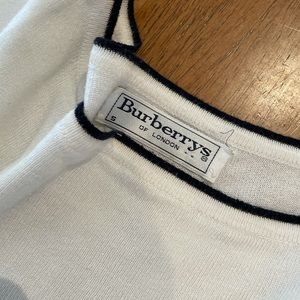 Soft Burberry sweater/shirt. Pure white with black trimming and a scoop neck. High quality with no signs of usage. Size small but fits loosely. Such a great garment, both stylish and casual<3
