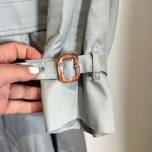 This is a beautiful Burberry Sz 12L Vintage Burberrys Gray Trench Coat With Wool Zip Out Lining. In excellent condition. Only issue is the brown leather buckles that only need a leather market touch up. Zip out baby check lining. Hidden buttons and hook and eye at the neck. Two buttoned pockets. Heavy cotton trench keeps warm and comfortable. No tears. Very small spot as show at bottom front. No odors. Back is buttoned and if need be can be in buttoned when you sit.