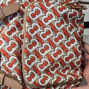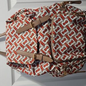 Burberry TB Monogram rucksack backpack featuring the iconic TB chain print in orange/red, beige, and white. Crafted from durable technical canvas with smooth leather trim and gold-tone hardware. A stylish and functional luxury backpack perfect for everyday use, travel, or statement streetwear looks.