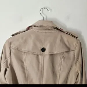 Tailored double-breasted trench featuring a belted waist. Classic collar with shoulder epaulettes and cuff straps. Front welt pockets and black buttons for contrast. Polished, versatile outerwear ideal for layering. Sold as is please see pictures missing last button but will come with it
