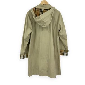 Classic Burberry trench coat. Tan color with plaid cuff detail. Timeless design.