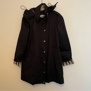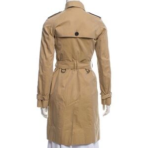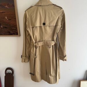 Classic Burberry trench coat. Double-breasted with belt. Timeless tan color.
