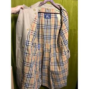 Stunning and unique Burberry trench coat. Double breasted with bronze buttons and lace up back detail. Size large but would fits more like a S/M. Includes embellished leather belt. Great condition!