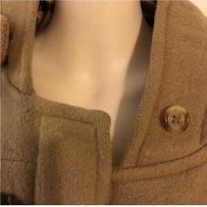 Comes from clean home. No smoke or pets. Stylish plaid woolcoat with a classic design. Features a blend of beige, black, and red colors.