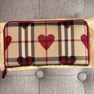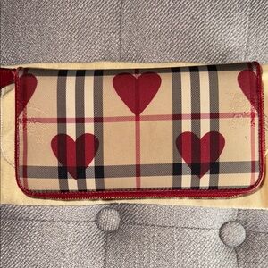 Very Rare limited Edition!!!Chic Burberry wallet with heart motif. Features iconic check pattern and red trim.