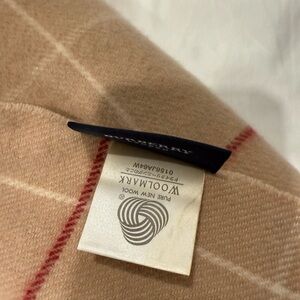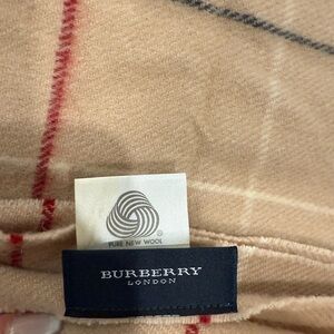 This luxurious Burberry scarf features a classic tan and red plaid pattern, crafted from soft wool for a cozy feel. The elegant design is accentuated by subtle black lines and a small embroidered logo, making it a timeless accessory for any wardrobe.