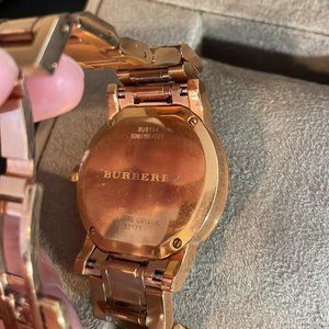 Burberry The City Quartz Watch - Rose Gold color, Stainless Steel 34mm. Authentic. Condition: Excellent, worn less than 5 times then kept in unused storage. Some minor hairline scratches, overall needs light polishing or cleaning to look like new. Circumference when watch latch is closed and around wrist is about 7 inches. Items included: Box and Care Booklet. Does not include batteries.
