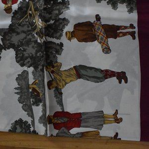 I've listed this as New as it looks new ... but "some indents" from poor folding. Great for golfers or any sportsman/woman, the scarf depicts golfers in all panels dressed in traditional, older garb of knickers, sweaters, hats, etc. Background is a very light beige with greens, browns, reds, and golds as the primary colors. Border is dark red (like maroon). Material: 100% silk. Made in Italy. Dimensions: 34” x 34”.