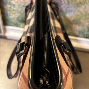 Elegant Burberry tote with iconic check pattern. Features pink and black tones. Ideal for stylish outings.