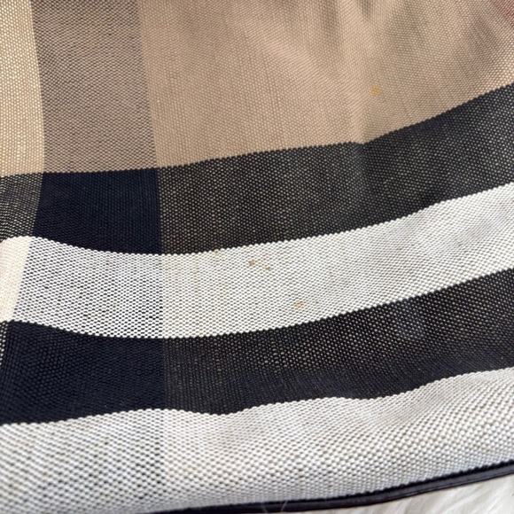 Burberry Tottenham Tote Bag with signature plaid pattern. Features rich brown leather handles and accents. Ideal for versatile styling.