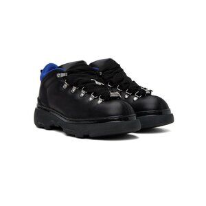 Premium and built for comfort, these Burberry Trek Sneakers blend rugged style with luxury craftsmanship. Featuring smooth black leather, bold black laces, and royal blue mesh lining, these shoes offer a statement look from heel to toe—including the oversized Burberry logo embossed in the sole.