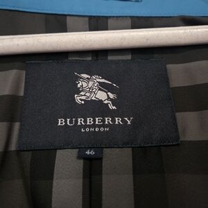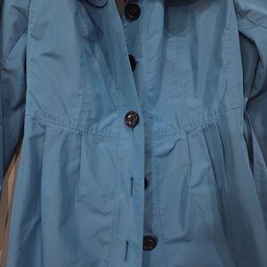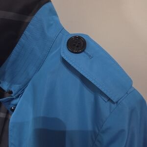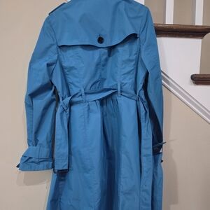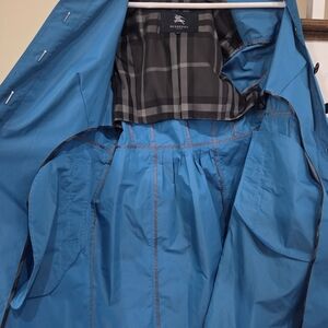 Elegant Burberry trench coat in vibrant beautiful blue. Features classic button design and adjustable belt. Excellent condition.