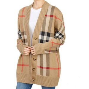 This merino wool-blend cardigan features an all-over jacquard check pattern. Features a V-neck, dropped shoulders, long sleeves, and ribbed edges.