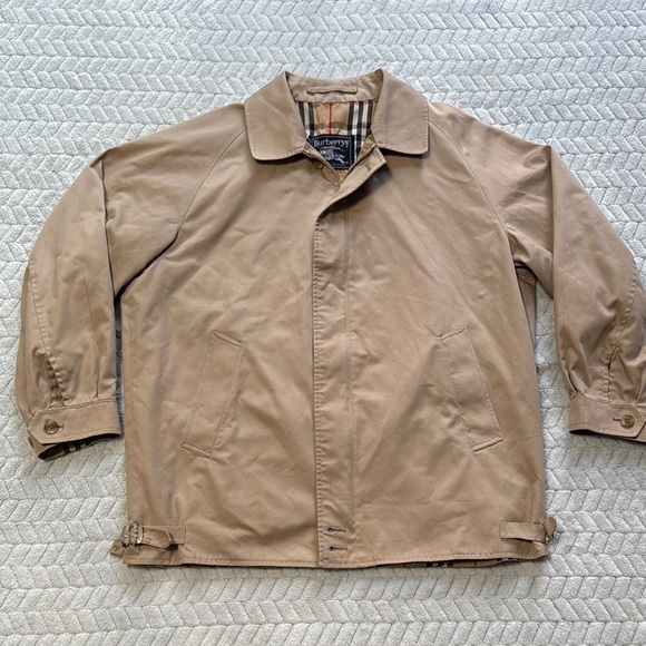 Experience timeless elegance with this Burberry tan trench coat, crafted from a water-resistant material. Its classic design features a traditional collar and a relaxed fit, making it a versatile addition to any wardrobe.